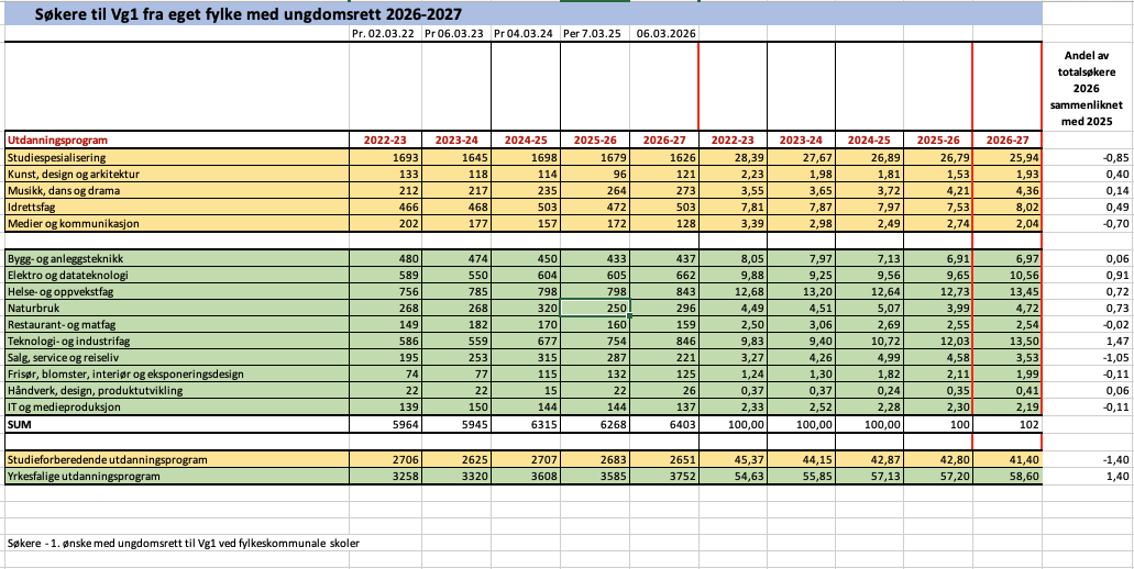 Fristen for å søke videregående opplæring var 2. mars. Fra høsten ønsker 58,6 prosent å gå yrkesfag. Dette er en økning på 1,40 prosentpoeng fra i fjor.